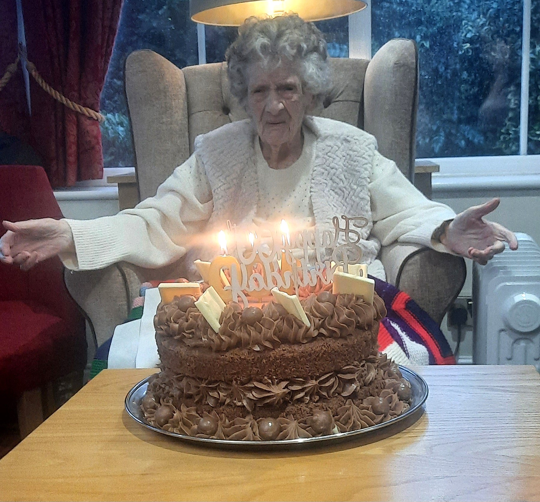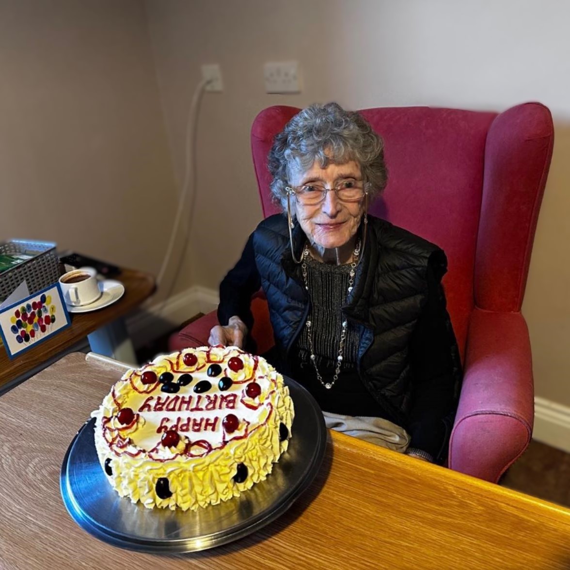 Selina was joined by staff, relatives, friends and other residents as she received a telegram from the King in recognition of her landmark birthday. A party with Selina’s favourite entertainers, Dark Moon was arranged for her by the family and the staff team at Stamford Bridge Beaumont, there was champagne to toast this very special occasion and a special birthday cake made by the home’s catering team.