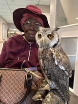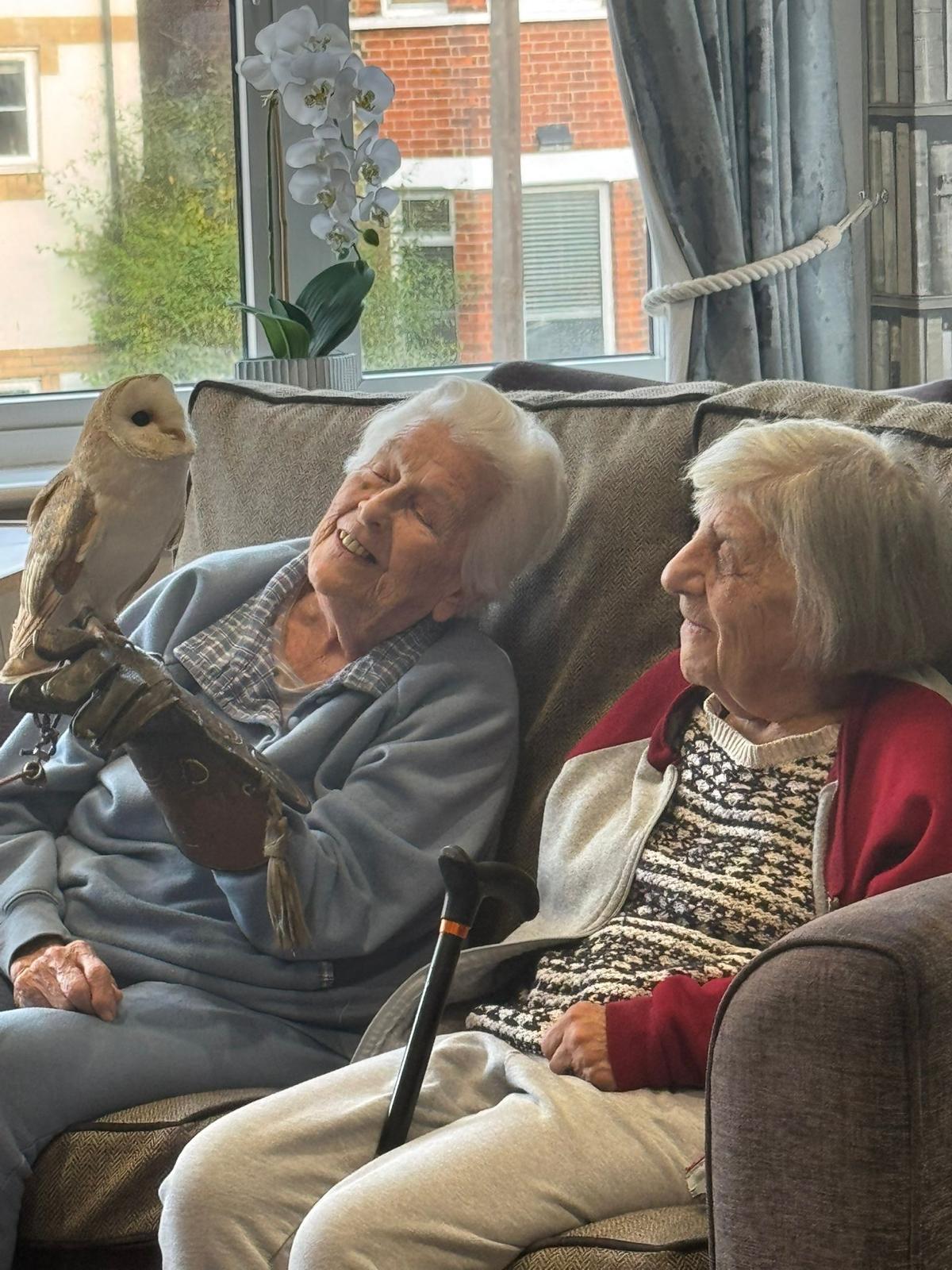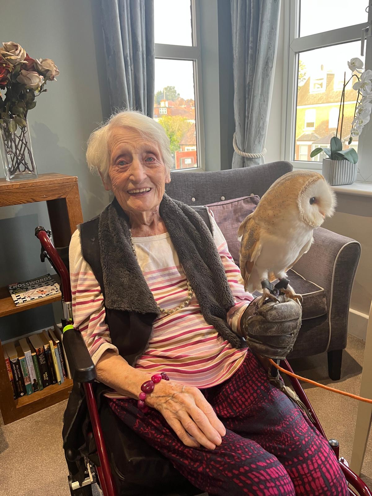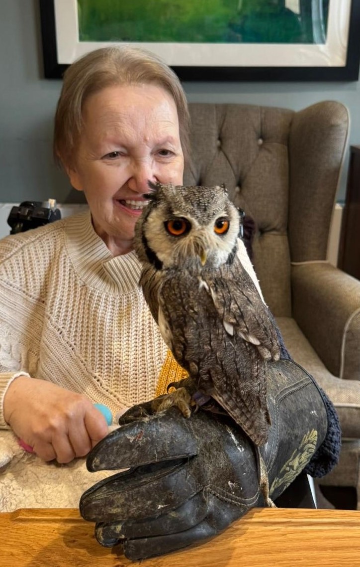 Resident Lucilla was especially impressed and excited by the visit from the Owls as they are her favourite animals: She said, “As a child I used to love to hear the calls of the Owls and was blessed to have one in a nearby barn. Today was very enjoyable and it was wonderful that the Owls were free to flutter their feathers amongst us and sit with us”
