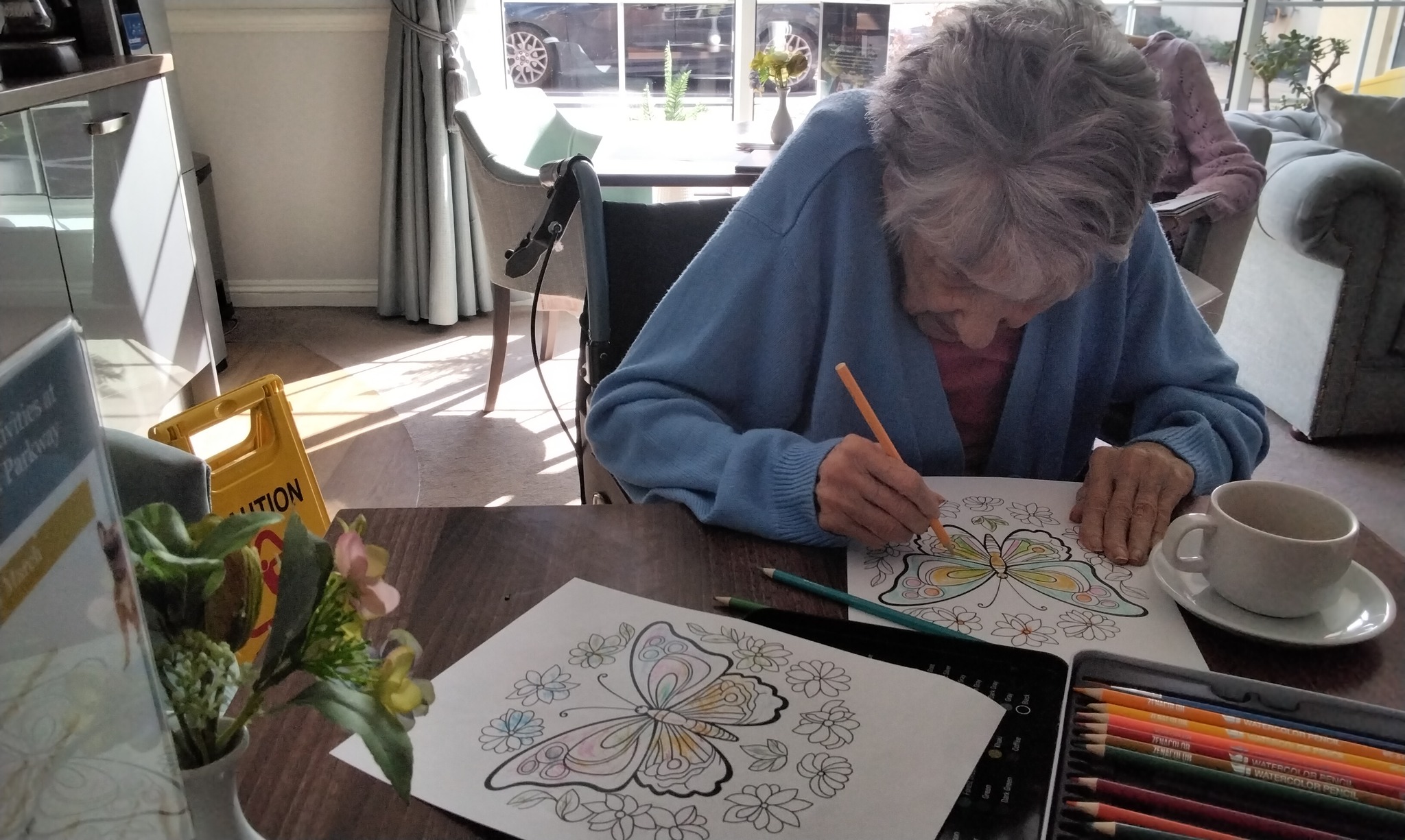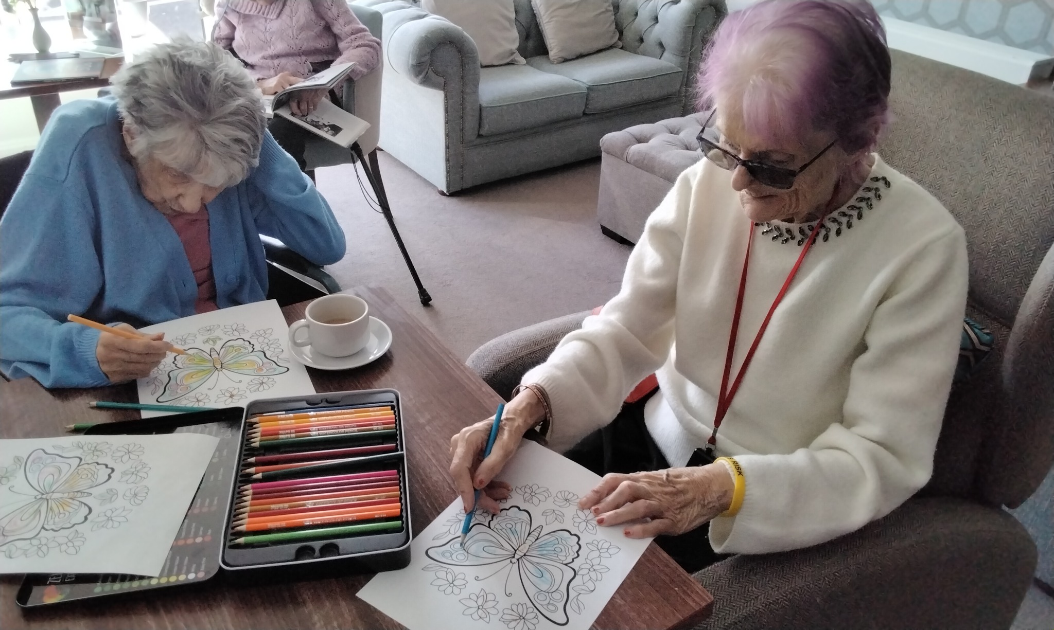 Some mindful colouring while chatting to their fellow residents, enjoying refreshments and discussing the beautiful sun shining in the room, a reminder that Spring is just around the corner, which in turn brings smiles and radiance to the residents.