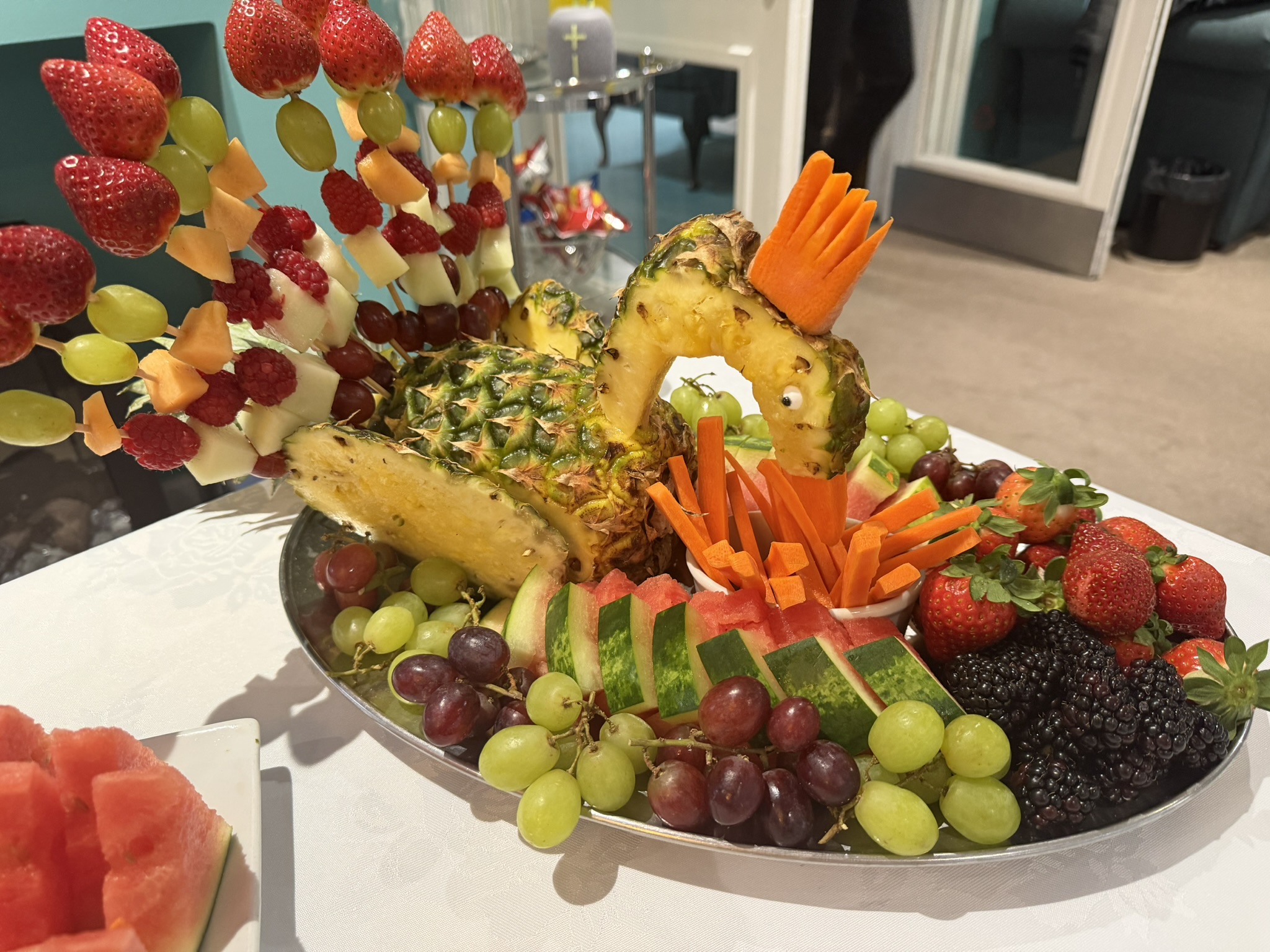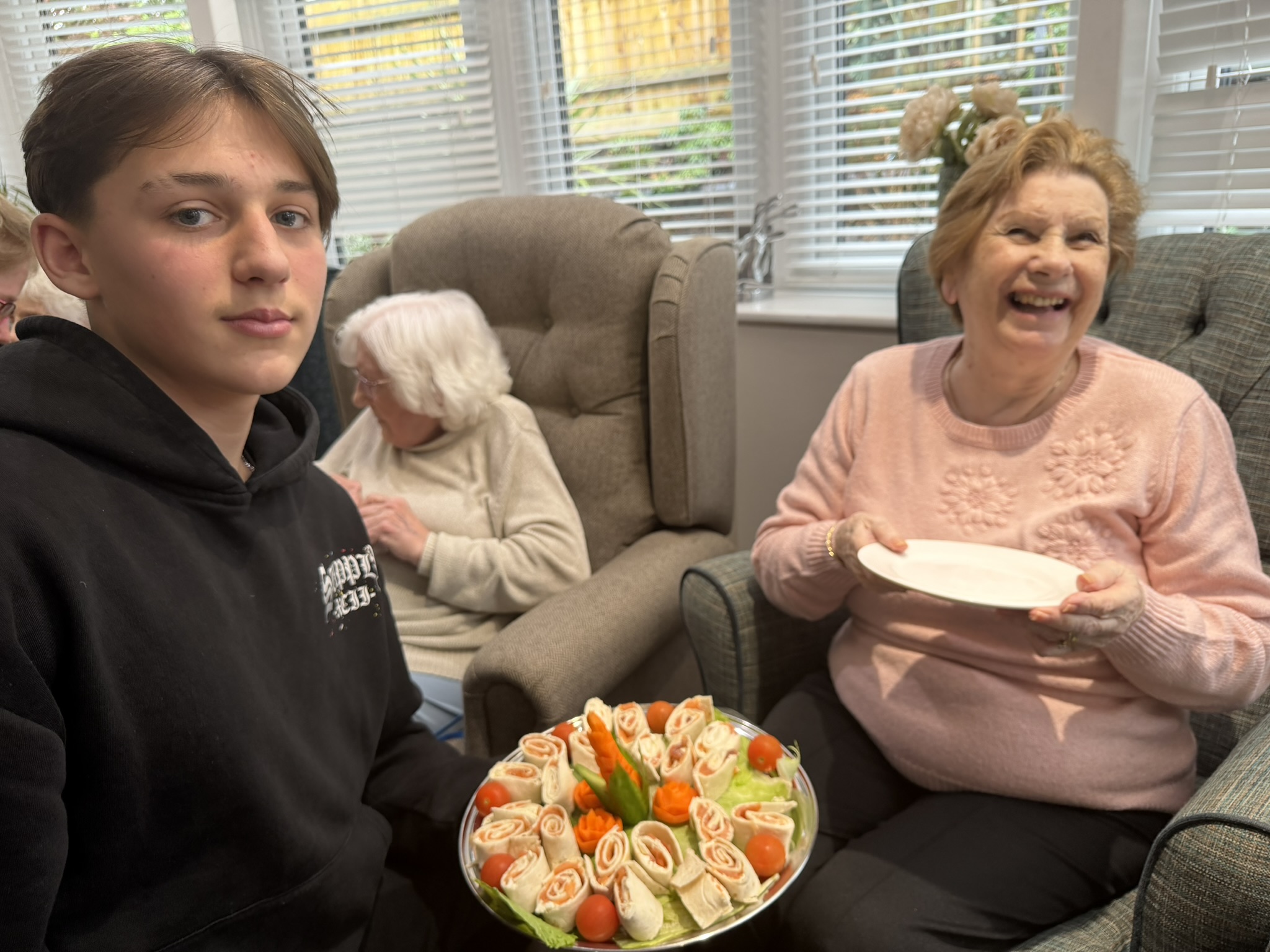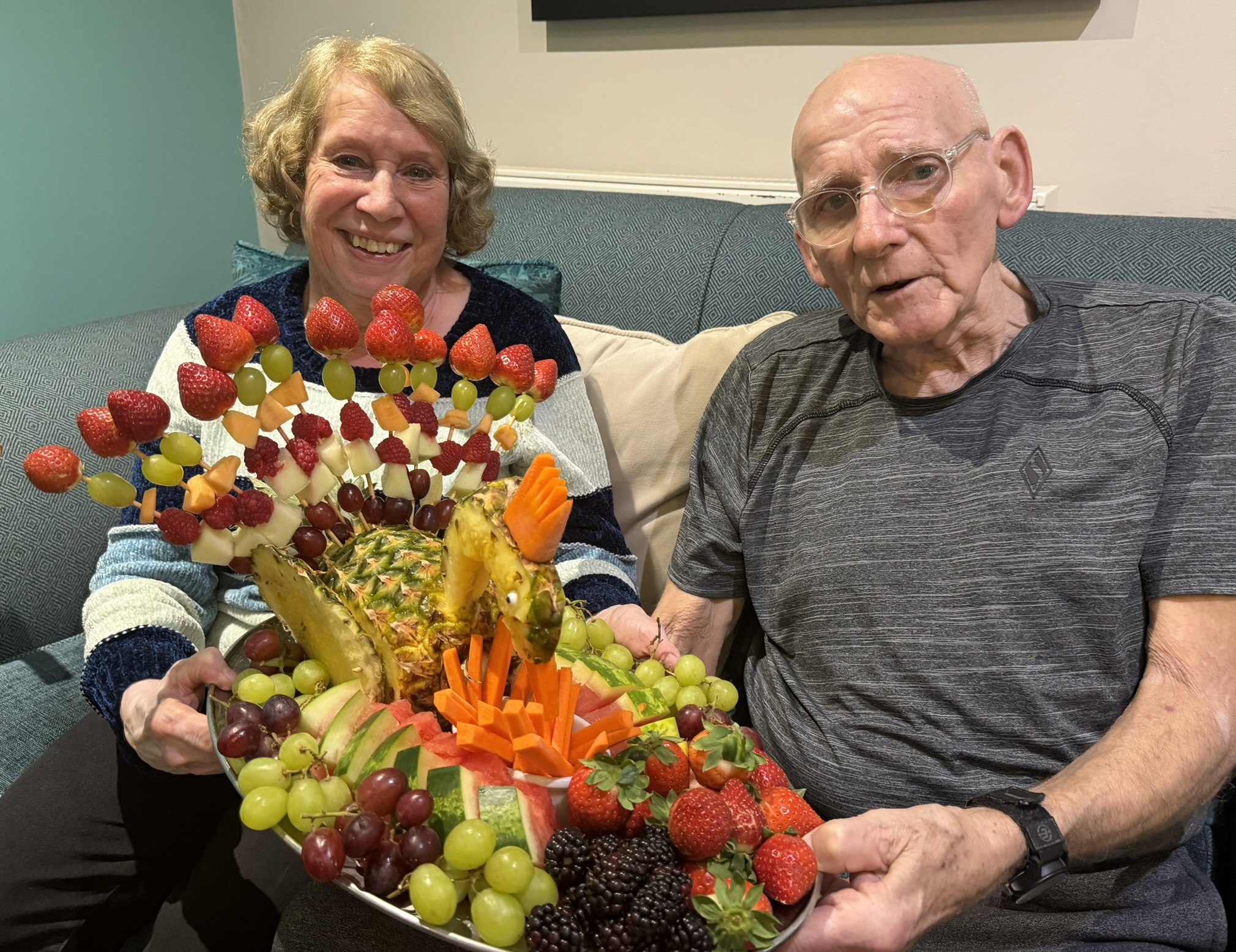 We have been enjoying seated exercise sessions with the students in this team as part of their college course. The exercise session was followed by a selection of homemade smoothies, strawberries and banana, Tropical Fruit and Berry Blast, along with some healthy snacks, including smoked salmon and cream cheese pinrolls. Our very talented chef, Jules, wowed us all with a beautiful peacock carved out of fruit and vegetables.