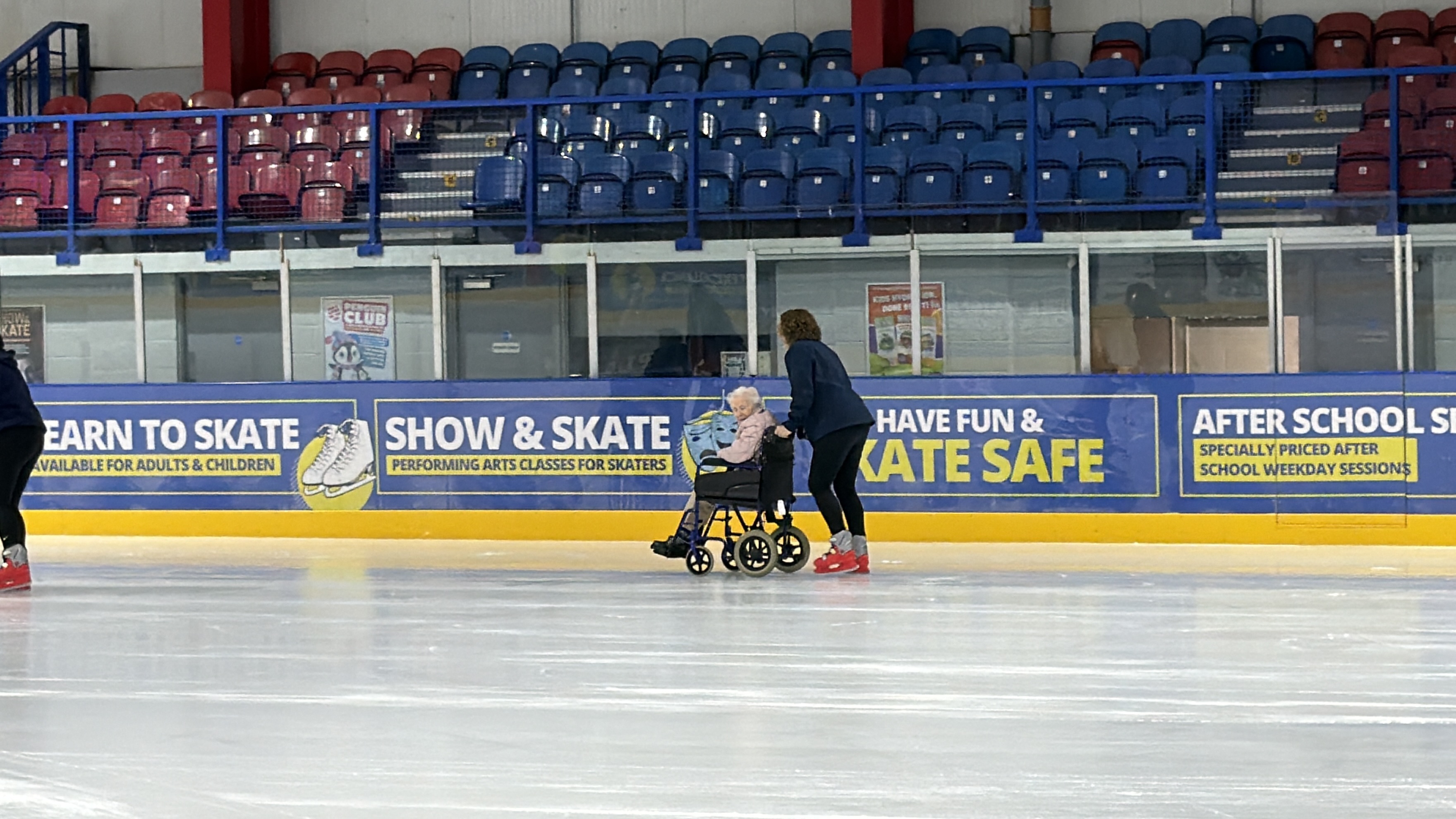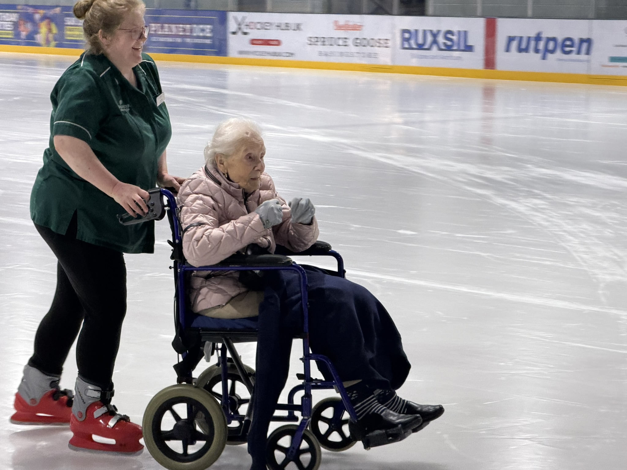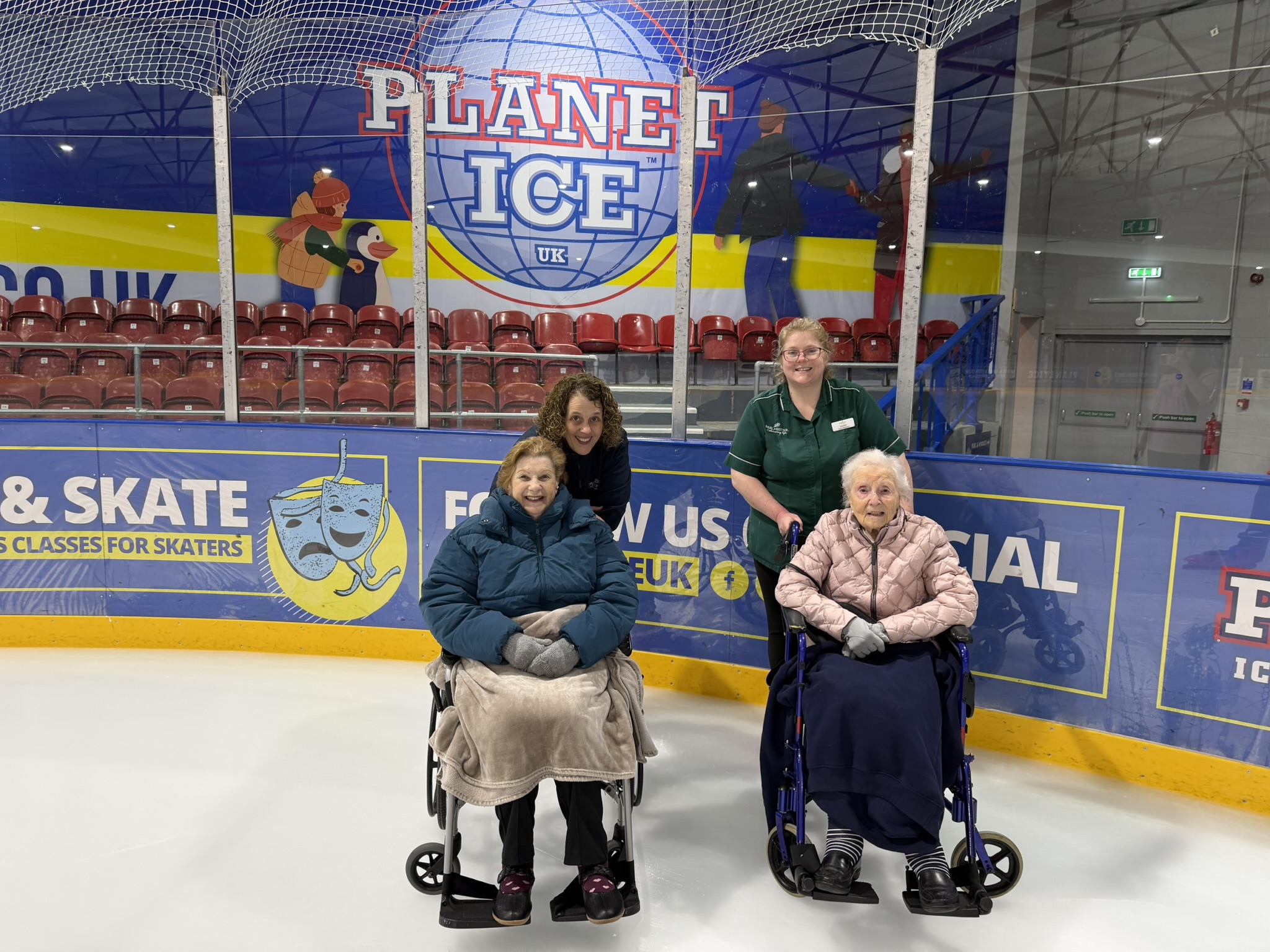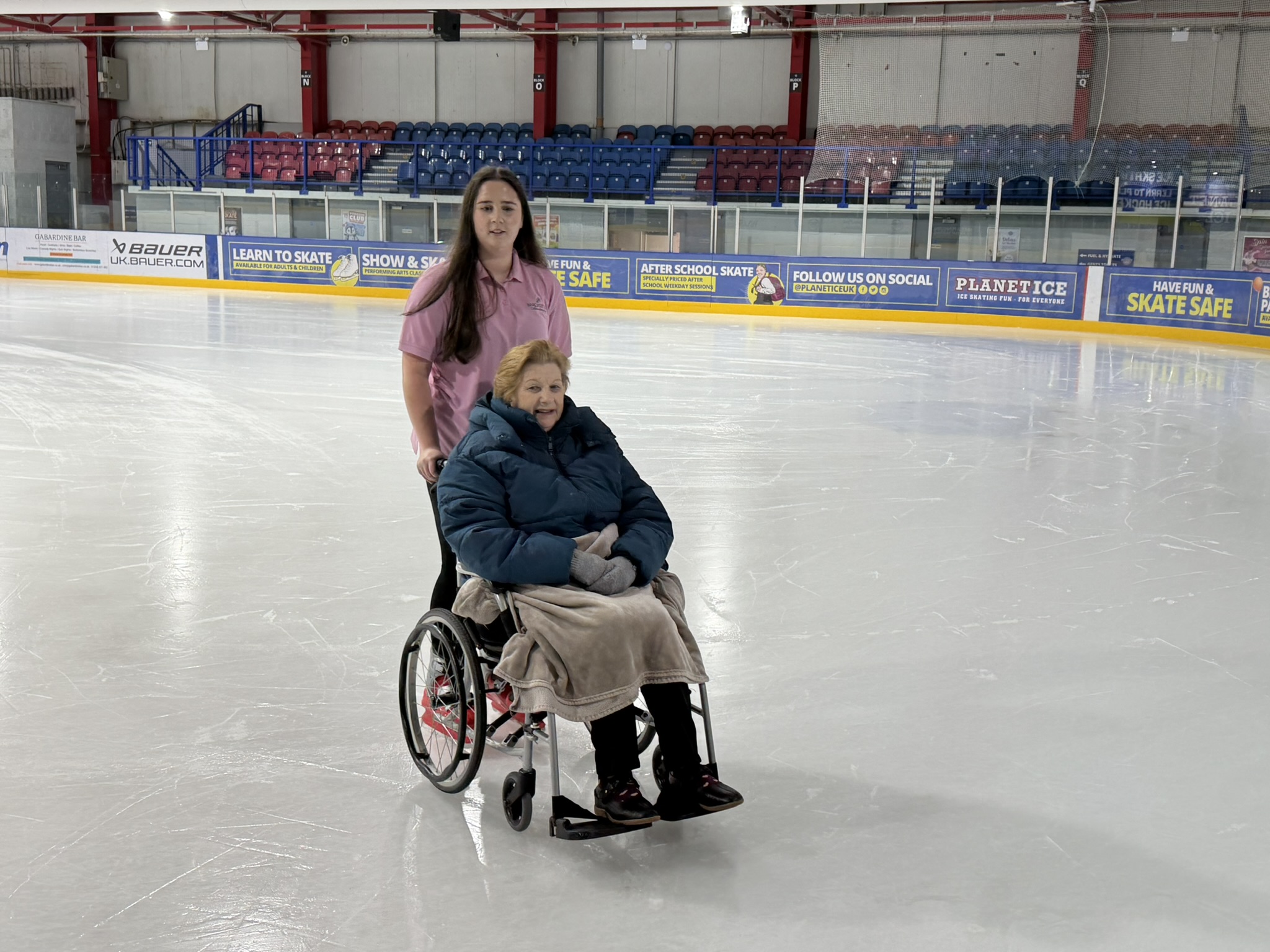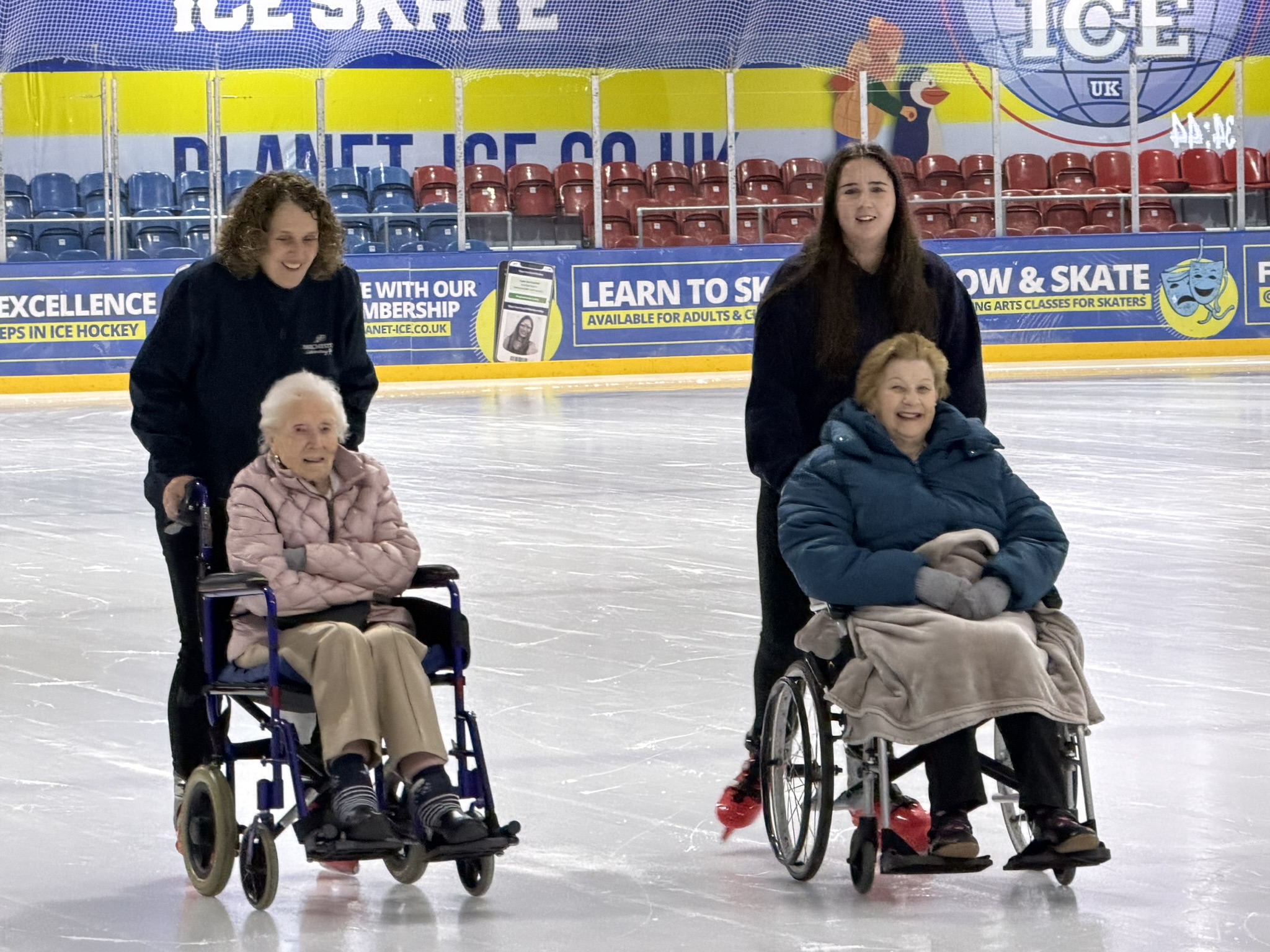 Shirley and Margaret enjoyed a fun-filled and unforgettable morning when they visited Planet Ice for a wheelchair ice skating experience. Wrapped up warm, they took to the ice in their wheelchairs, laughing as they whizzed round the ice rink.