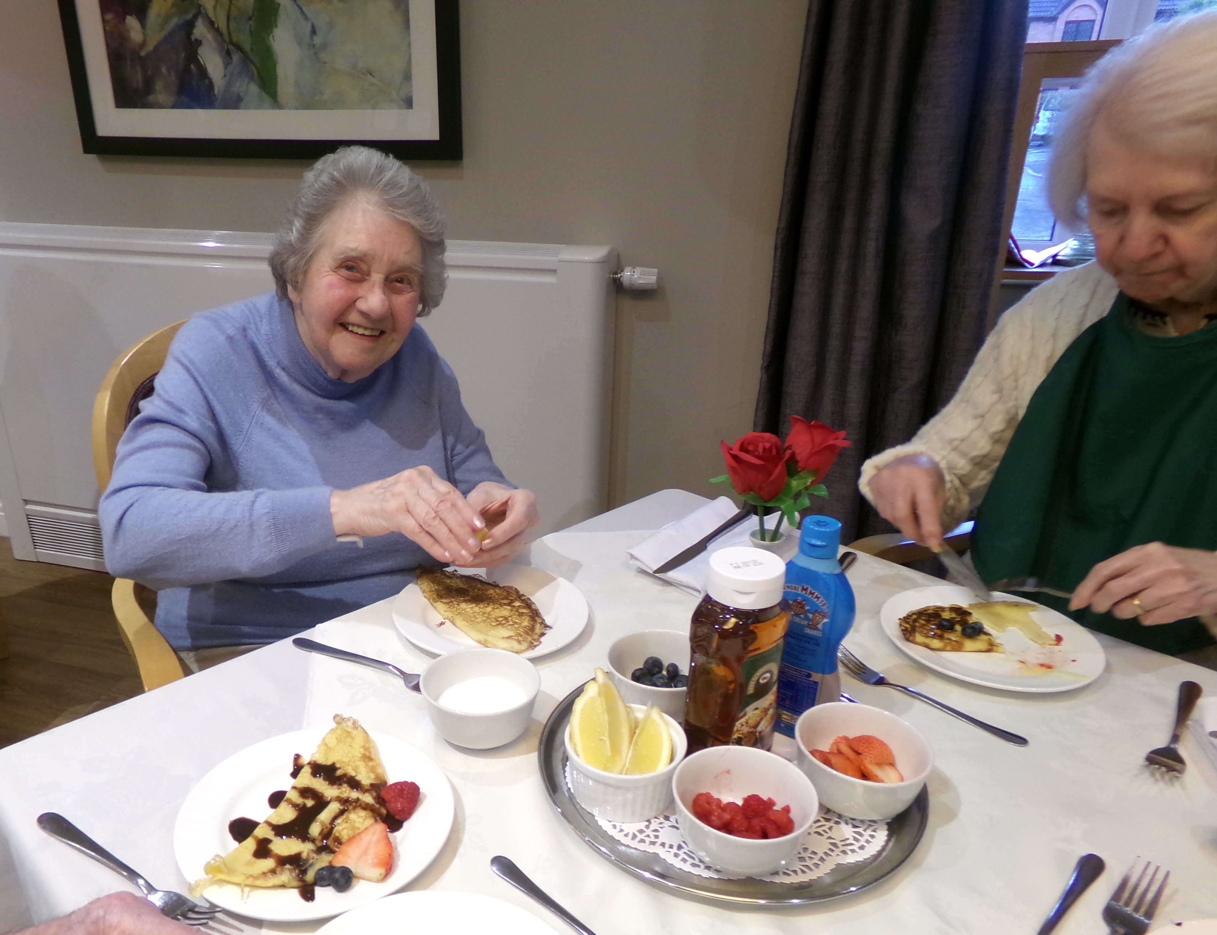 The residents had a wonderful day, filled with pancake-inspired activities. We enjoyed homemade pancakes made by our Chef, Tom, and decorated them with fresh fruit, berries, syrup and chocolate. The favourite is the traditional squeeze of lemon and sprinkle of sugar.