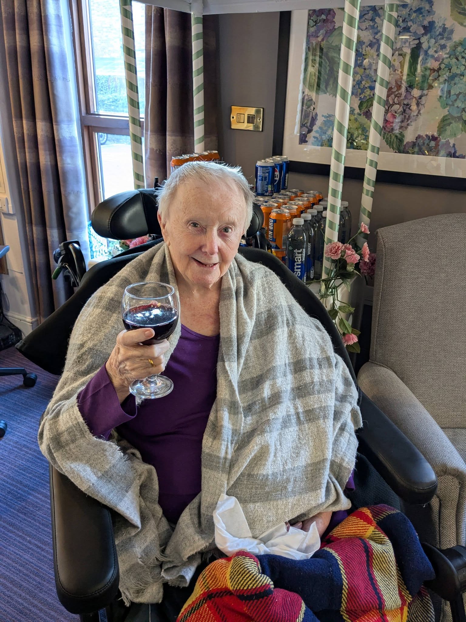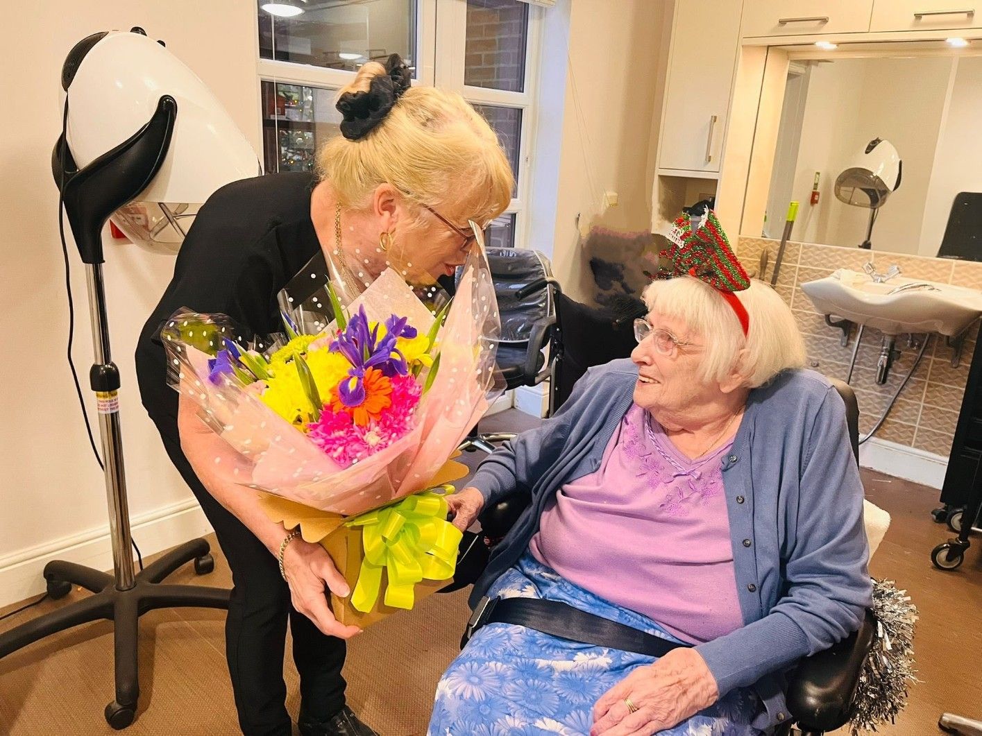 Jane was thrilled to mark this incredible milestone, surrounded by friends, smiles, and plenty of celebration. Our Resident Ambassador, Elizabeth, along with members of our dedicated team, presented Jane with beautiful flowers, a glass of Prosecco, and a delicious birthday cake, which she generously shared with fellow residents.
