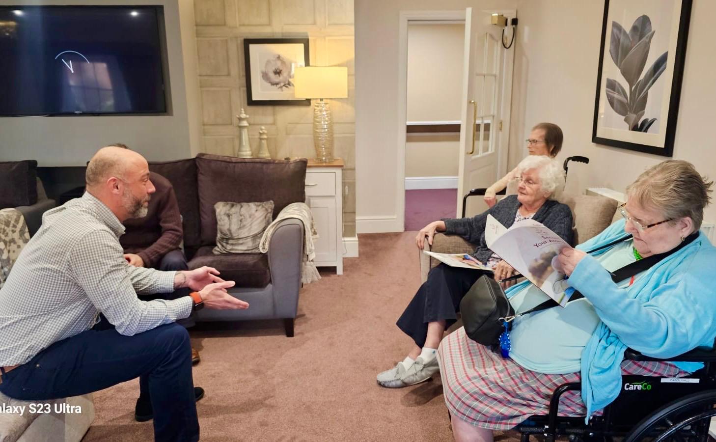 An early morning seated Yoga session . The residents love activities and one of their favourites is a seated yoga session led by Rik one of our Activities team members.