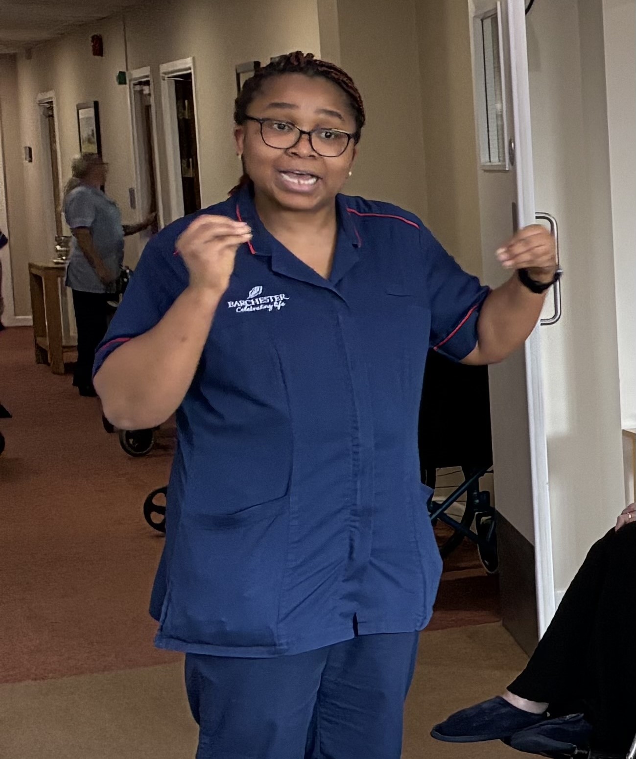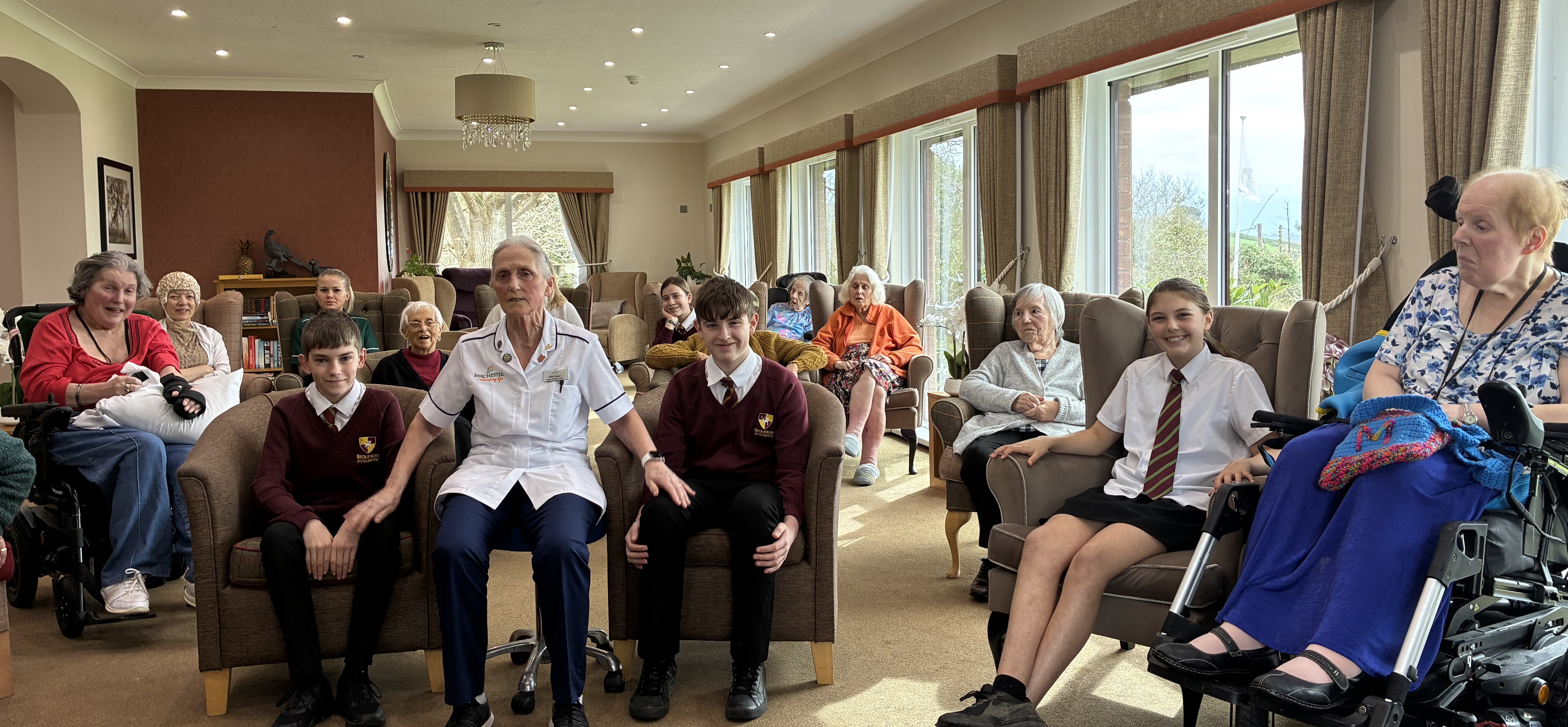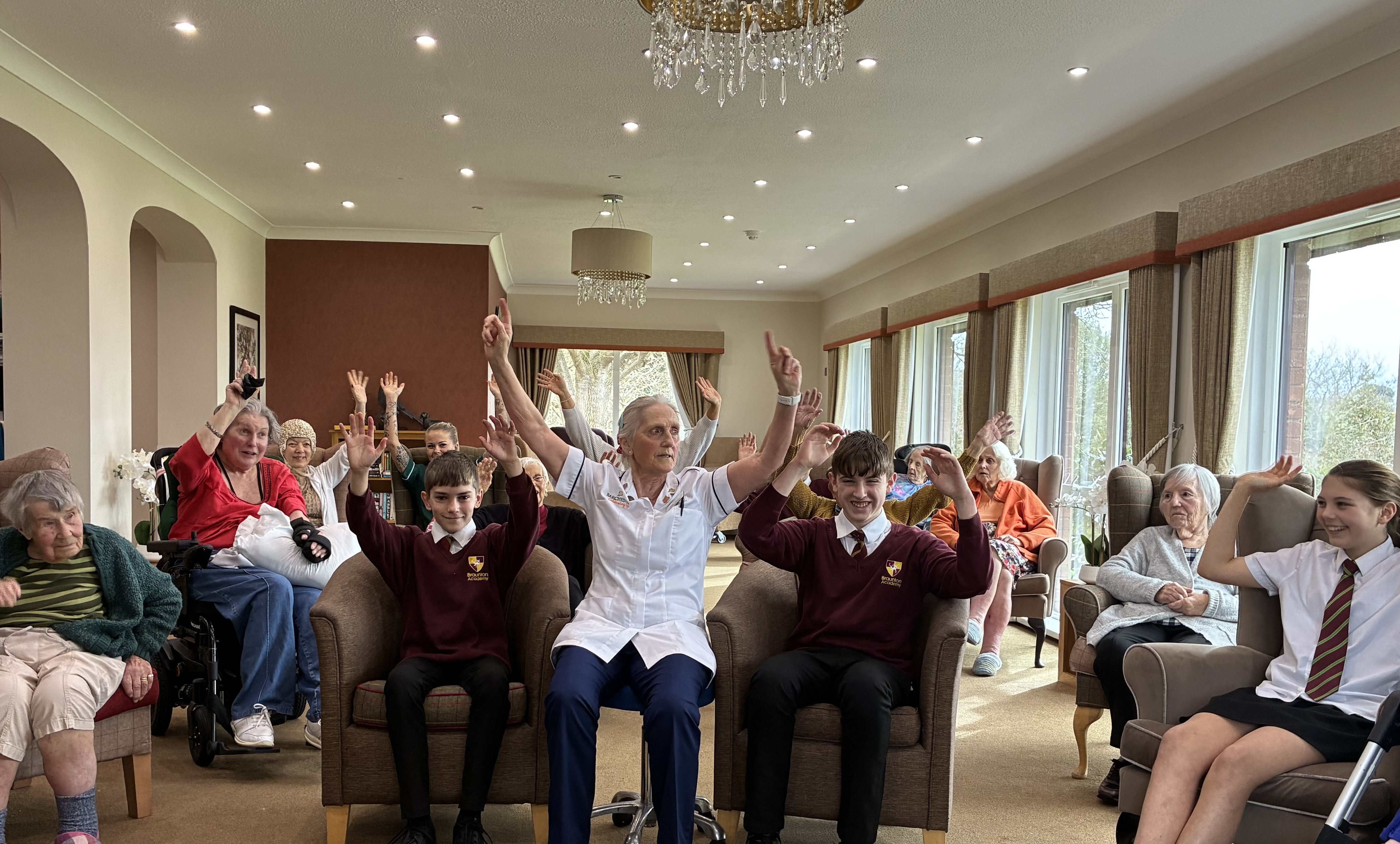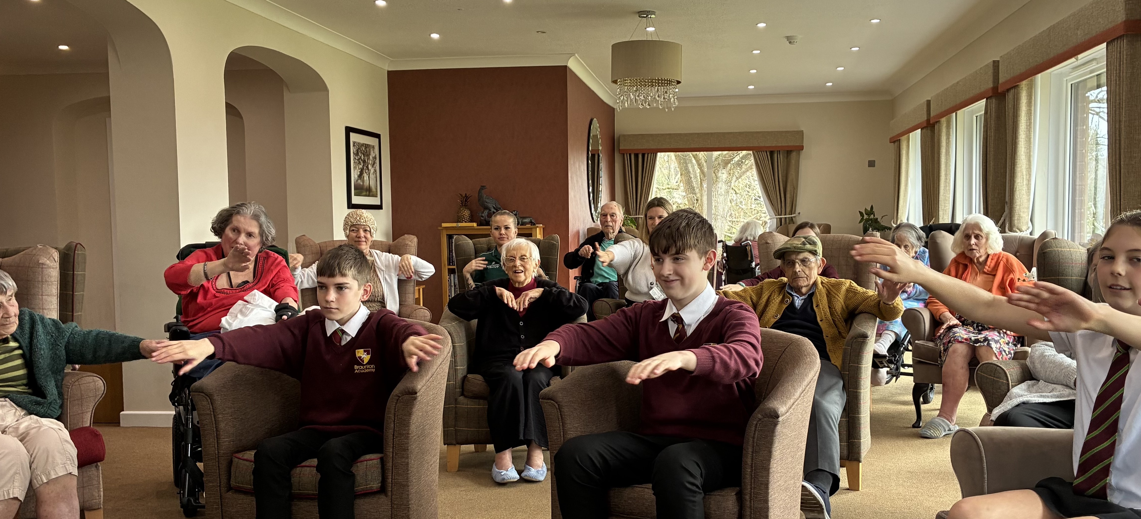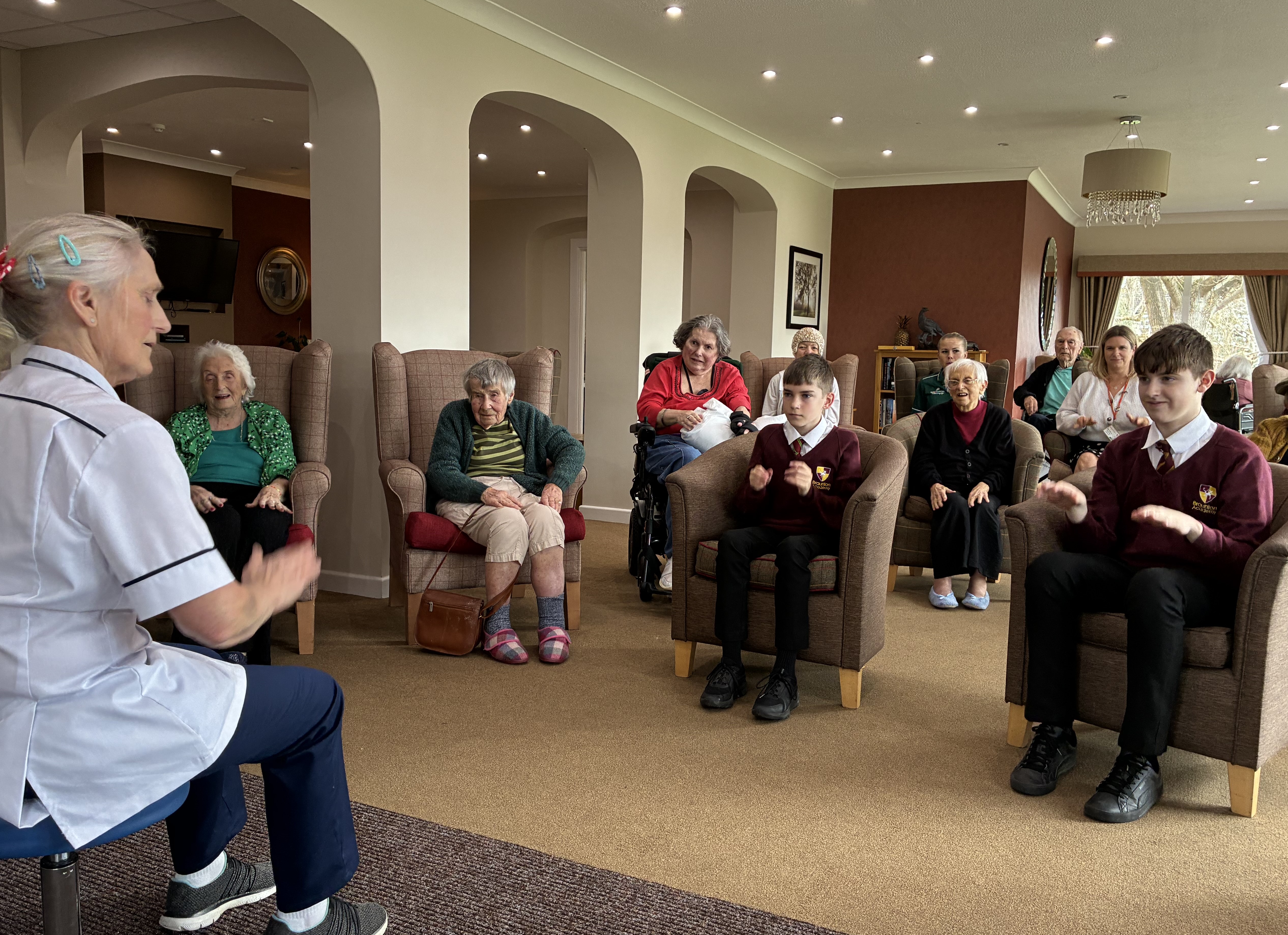 So today, Tyspane Care Home welcomed Braunton Academy, and arranged an exercise class (one our residents would normally complete) with Babs Spear. Residents and Year 8 students participated in a lively armchair class, and wow, the atmosphere was electric. Smiles, cheers, and singing could be heard all around the home. The class was followed by talks from George (Assistant Physiotherapist) about her passion for Art and Bertha (Unit Lead Nurse), who talked about Nigeria, which was absolutely fascinating.