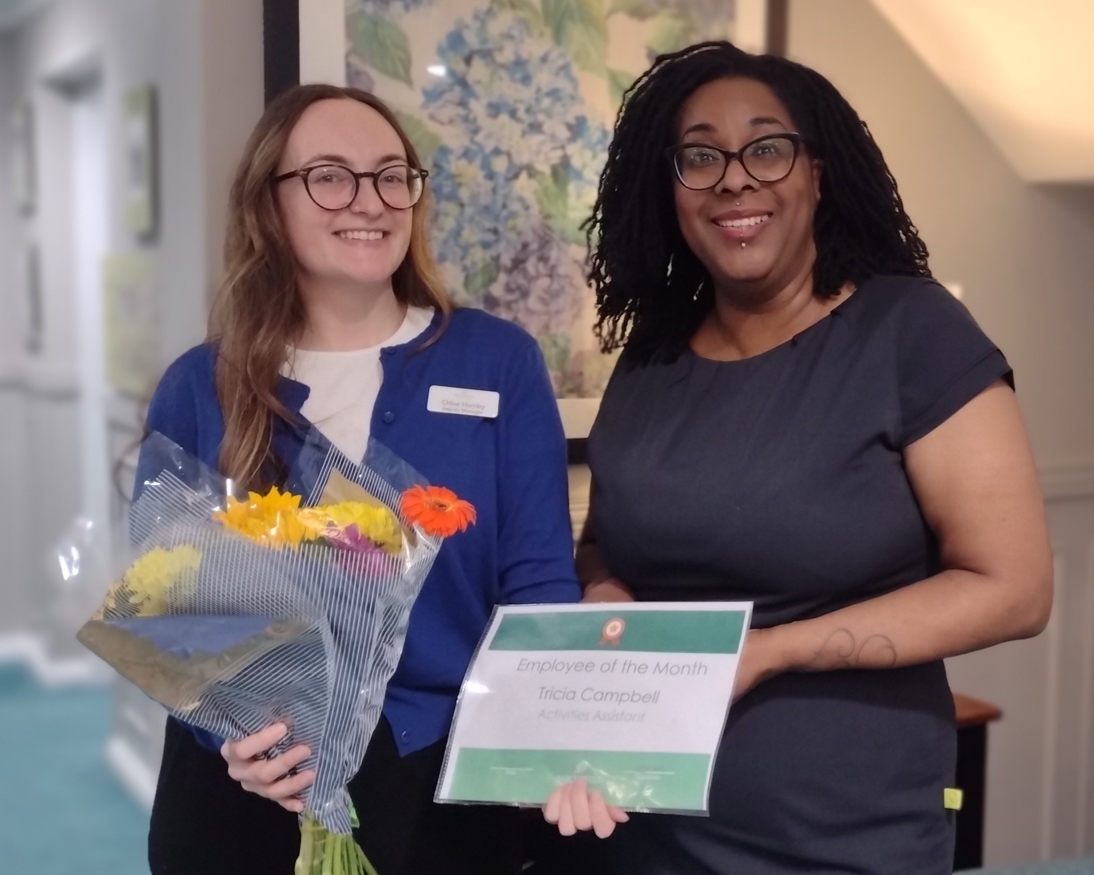 The sessions are enjoyed by both residents and members of the local community looking for a moment of rest and relaxation. Deputy Manager; Chole had the pleasure of presenting Tricia with her certificate and bouquet thanking her for her continued service to the overall wellbeing and life enrichment of our residents.