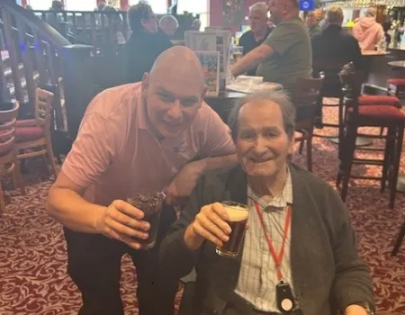 Scott, our Activities Lead, received the message and went straight to Fred with the question. Fred’s face immediately lit up. “Of course I remember Ray!” he said with a big smile. “We were great mates – I never forgot him.” Scott quickly got to work organising a reunion. Within a couple of days, Ray arrived at Broadway Halls, book in hand filled with old photographs, newspaper clippings – including a treasured piece on Wolves winning the FA Cup – and plenty of memories.