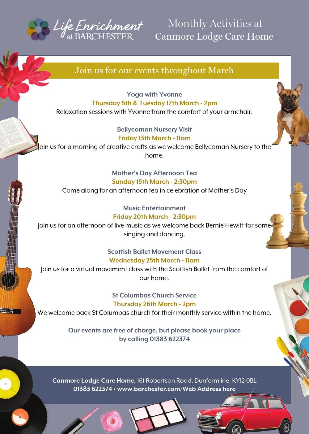 Our Activities Coordinators are committed to organising a variety of events as well as offering tailored programmes to stimulate residents both mentally and physically. There are regular outings in the minibus to local places of interest, such as trips to the beach for ice cream, pub visits for a pint, and regular trips to Dobbies for tea and cakes. Georgie Girl, an old English sheep dog, also stops by the home on regular basis for pet therapy. Musical entertainment is a big hit with residents as well, so we book fan favourites to come and play at the home each month. At Canmore, relatives are always encouraged to join in on the fun too.