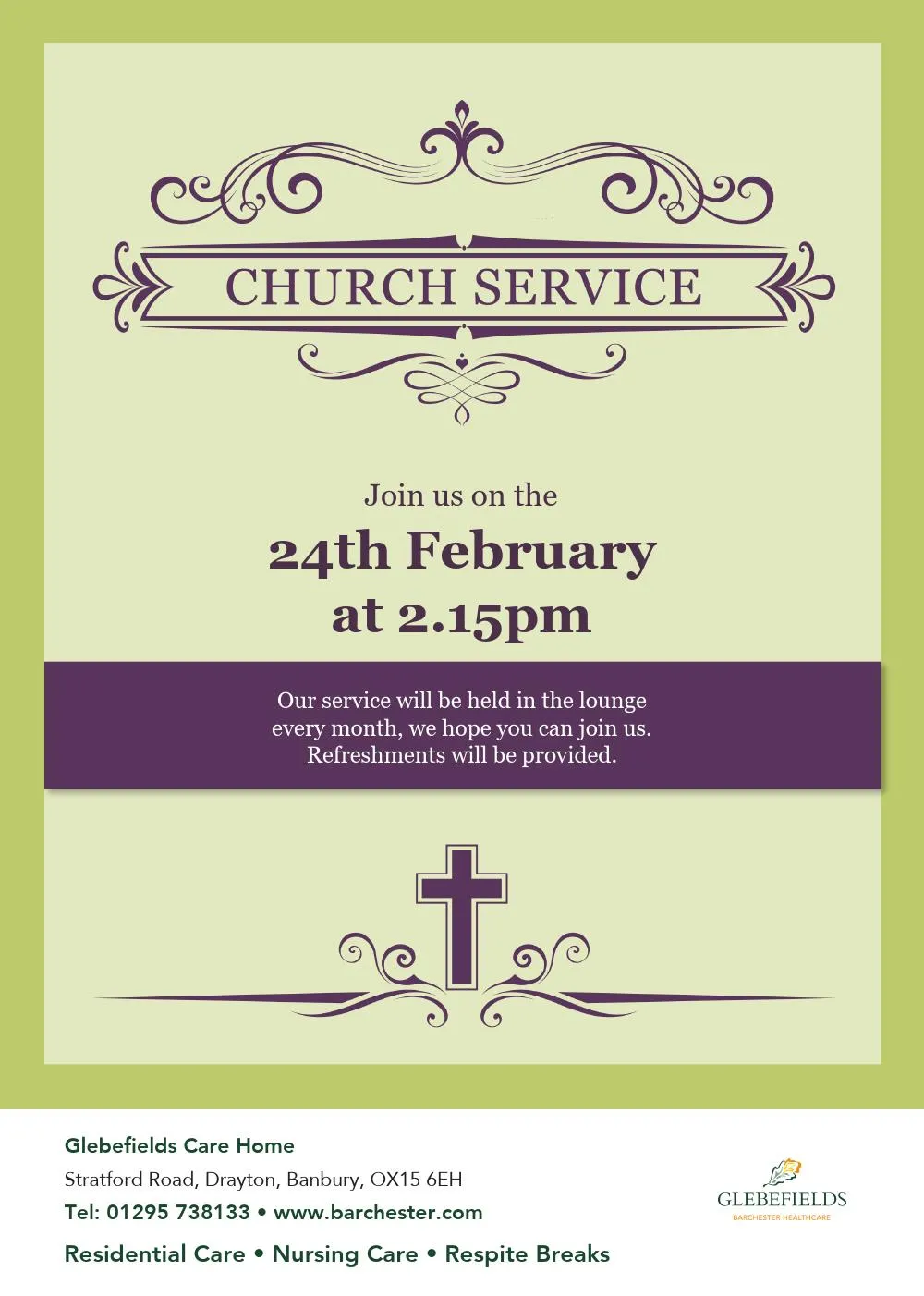 Making links with local groups and organisations to keep our residents’ part of the local community is a key part of my role, if you would like to make contact with me and our residents, please feel free to call me on 01733 246840 or drop me an email Glebefields.activities@barchester.com
