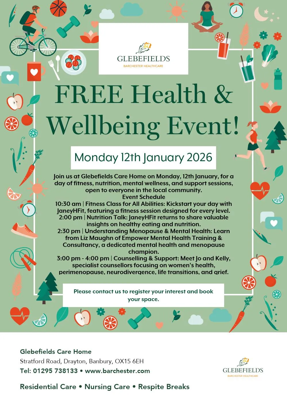 Join us at Glebefields Care Home, for a day of fitness, nutrition, mental wellness, and support sessions, open to everyone in the local community.