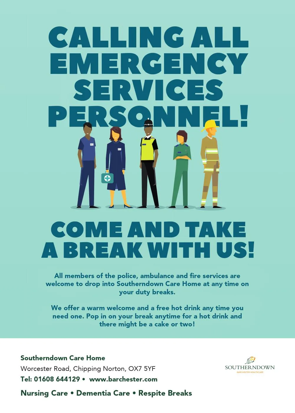 Calling all blue light workers - Come and take a break with us , we are offering free tea coffee and cake for all blue light workers.