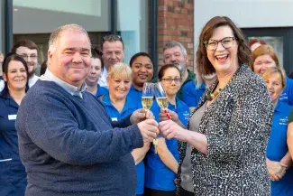Lucy Duffin, the newly appointed General Manager of Queens Manor was delighted to accept the keys to the latest 60-bed property on Queensferry Road from the Project Construction Manager Jock Aide from construction company McLaughlin & Harvey Ltd, who toasted the event with a glass of bubbles.