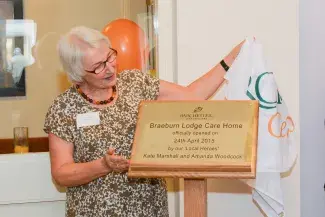 Local dementia support champion Kate Marshall, who manages the Square Hole Club for people affected by early onset dementia, unveiled a commemorative plaque at Braeburn Lodge on Braeburn Road to mark the official naming of the new care home.