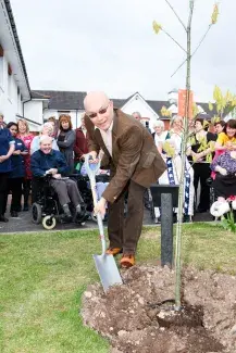 Chris Wallington sprinkled the first layer of soil onto the roots of the memorial tree at a planting ceremony held on 20th April, attended by residents, relatives and care home staff.